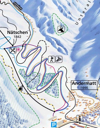 Falls Du es aber dort vor hast, mit dem Zug (Autoverlad) über den Oberalp-Pass (2044) zu fahren (siehe Bild), folgender Tipp: An der Station Nätschen oberhalb Andermatt schwupp aus dem Zug hüpfen und Board anschnallen um nach Andermatt runter zu fahren, um dann in Andermatt Bahnhof wieder in den Zug zu steigen! Sollte zeitlich problemlos reichen! (Vorher abklären ob der Zug in Nätschen auch anhält)