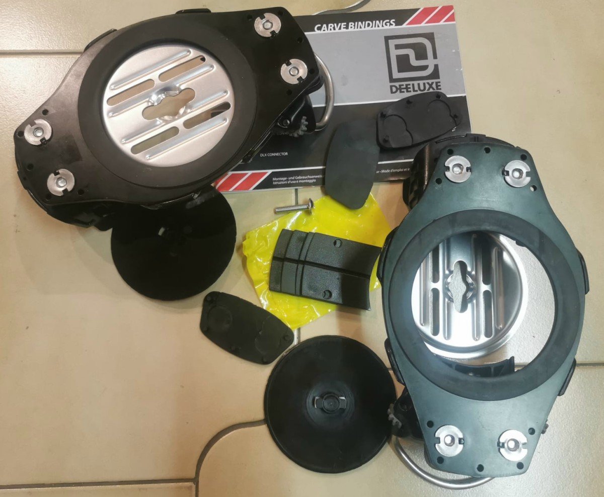 Attacchi hard snowboard Deeluxe DLX Connector Intec Step in, assolutamente identici agli F2 Intec Titanium in tutto tranne il coperchio copriviti liscio.