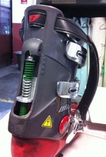 Per l'inclinazione di base del gambaletto ho posizionato il sistema originale + dritto possibile (pos1) ed ho fissato la squadretta ad "L" in modo da avere la stessa inclinazione con molla back leggermente compressa