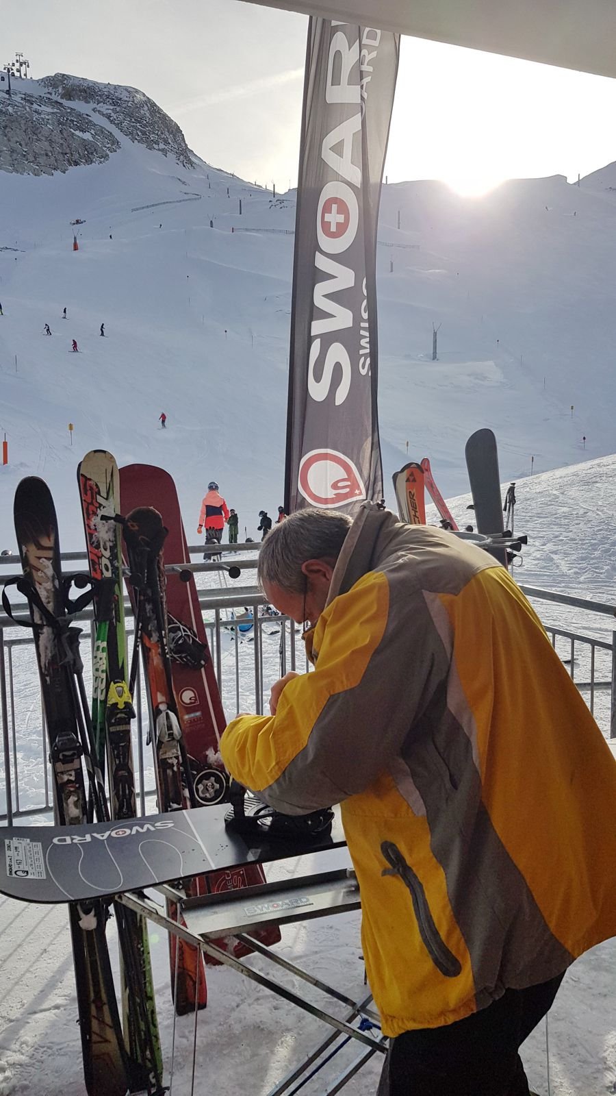 On Sunday, the weather forecast was much more optimistic and the day started beautifully indeed. Several of us made it first to the glacier, with a magnificent view and some freshly-prepared slopes. The conditions were great to put into practice the recommendations from the previous day. The SDT took place that day and it was great to meet EC-gurus like Patrice, Arnaud & Petr (+ several others whose names I did not always catch). There must have been around 40 EC'ers that day ? Unfortunately (for me), I lost the main group following a lost-snowboard incident