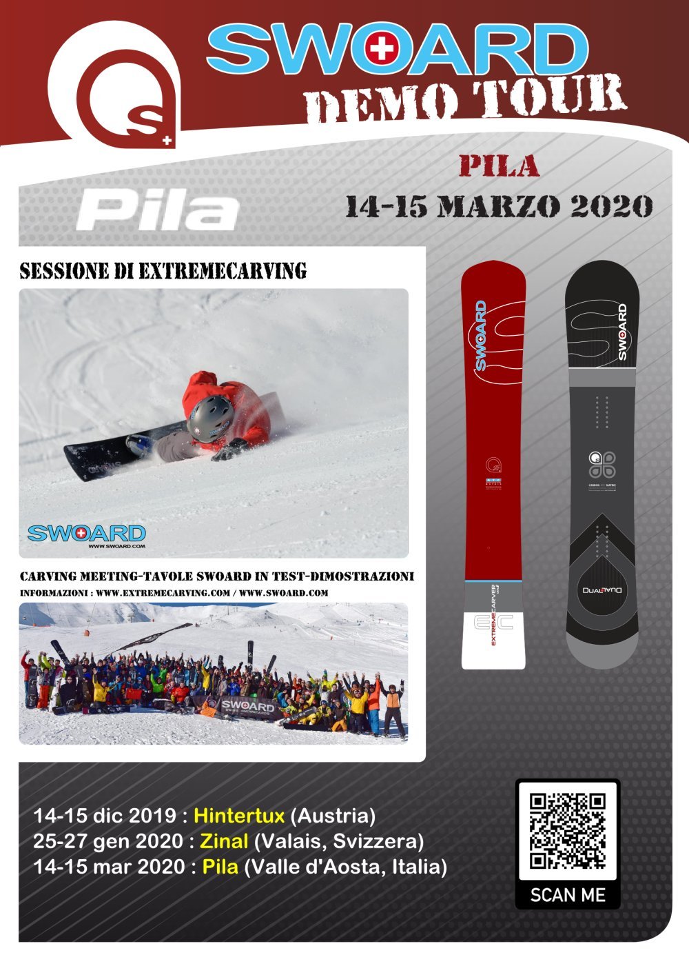 Swoard organizza la terza tappa dello Swoard Demo Tour. Un evento interamente dedicato allo Snowboard, aperto a tutti: hardboot e softboot. Durante l'evento sarà possibile testare le Swoard Extremecarver Gen 5, Extremecarver Pro 2 e Dual 2, assistere a dimostrazioni di Extreme Carving, e perfezionare la propria tecnica.
