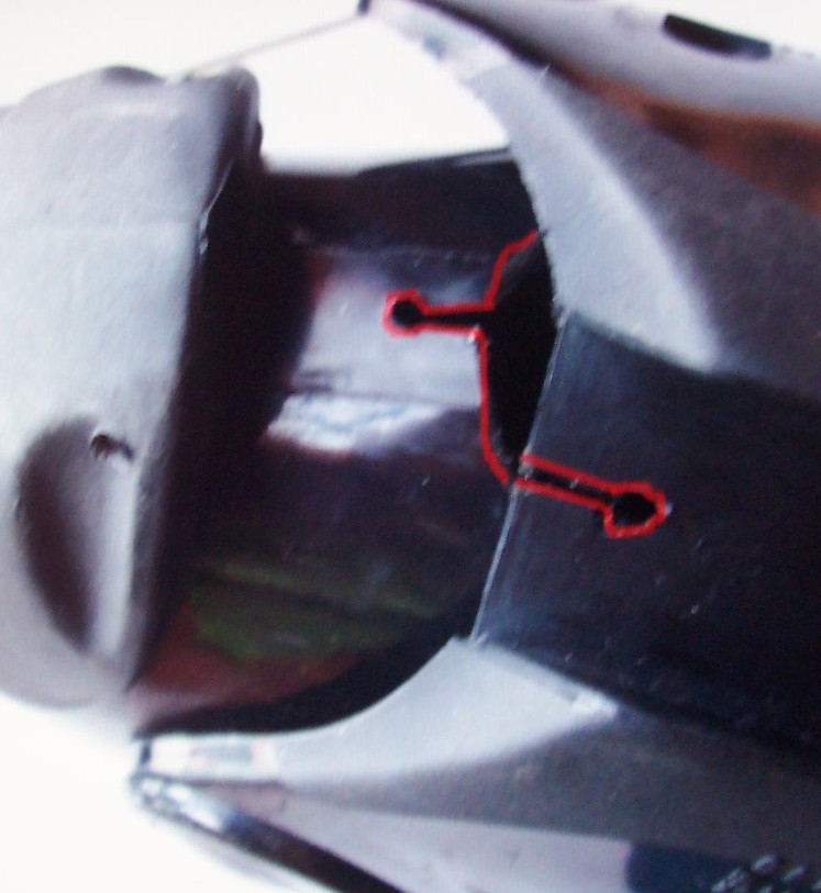 In sostanza, anche io avevo tagliato lo scafo (come da indicazioni di Arnaud) secondo "la linea rossa della foto" poi in seguito ho azzardato un'incisione più in basso, che ha permesso (queste sono le mie impressioni) una maggior deformazione dello scafo che così opponendo meno resistenza al gambaletto fa si che anche l'escursione in avanti sia maggiore, importante anche smussare bene le plastiche tagliate.