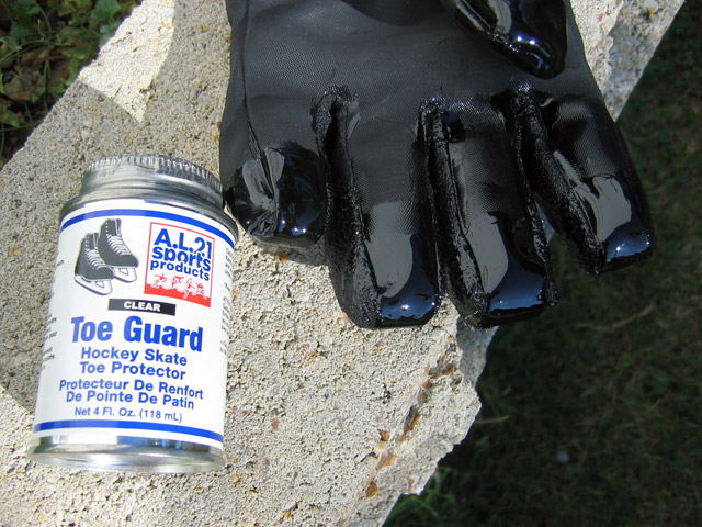 Entre temps je me suis servie d'un produit que l'on applique sur l'embout des patins de hockey sur glace pour les renforcer contre l'abrasion : Toe Guard (7,5€ le pot dans les mag spécialisés).